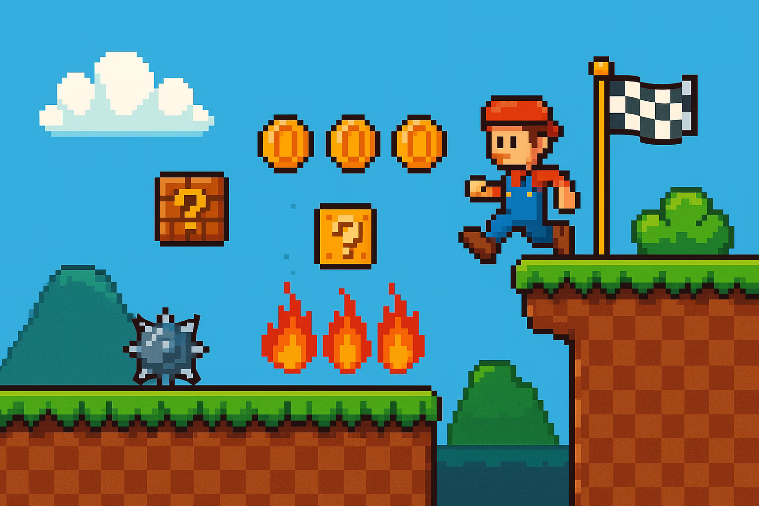 - Game mechanics: character movement, terrain design, checkpoints, traps